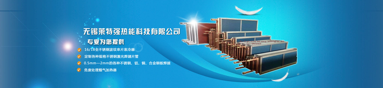 無錫萊特強熱能科技有限公司是專業生產:銅鋁復合散熱器、鋼制散熱器、鋼鋁復合散熱器、(鋼鋁、銅鋁復合,鋼帶鋼管、不銹鋼、高頻、全銅軋制)等翅片管,空氣熱交換器,熱管換熱器,空氣冷卻器,螺旋板式換熱器,列管換熱器,冷凝器,煙氣加熱器、余熱回收、TSR盤管的公司。